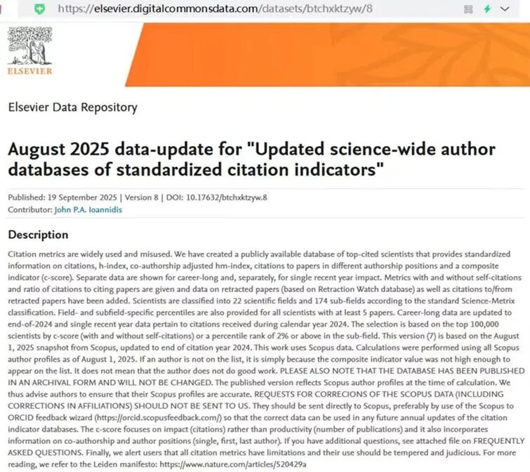 9月20日,斯坦福大学(Stanford University)与国际权威学术出版社爱思唯尔旗下的数据库(Elsevier Data Repository)联合发布了2025年度第八版《全球前2%顶尖科学家榜单》(World's Top 2% Scientists)。我院马超美教授凭借深厚的理论积淀与卓越的研究产出成功入选 “生涯科学影响力” 和 “年度科学影响力” 榜单。